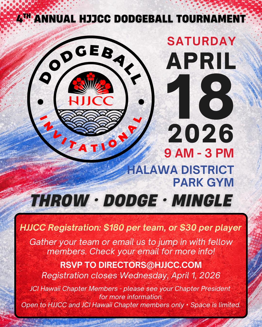 The 4th Annual HJJCC Dodgeball Tournament - Invitational is just around the corner. Join us for an exciting, action-packed day of friendly competition and camaraderie with fellow HJJCC and JCI members.